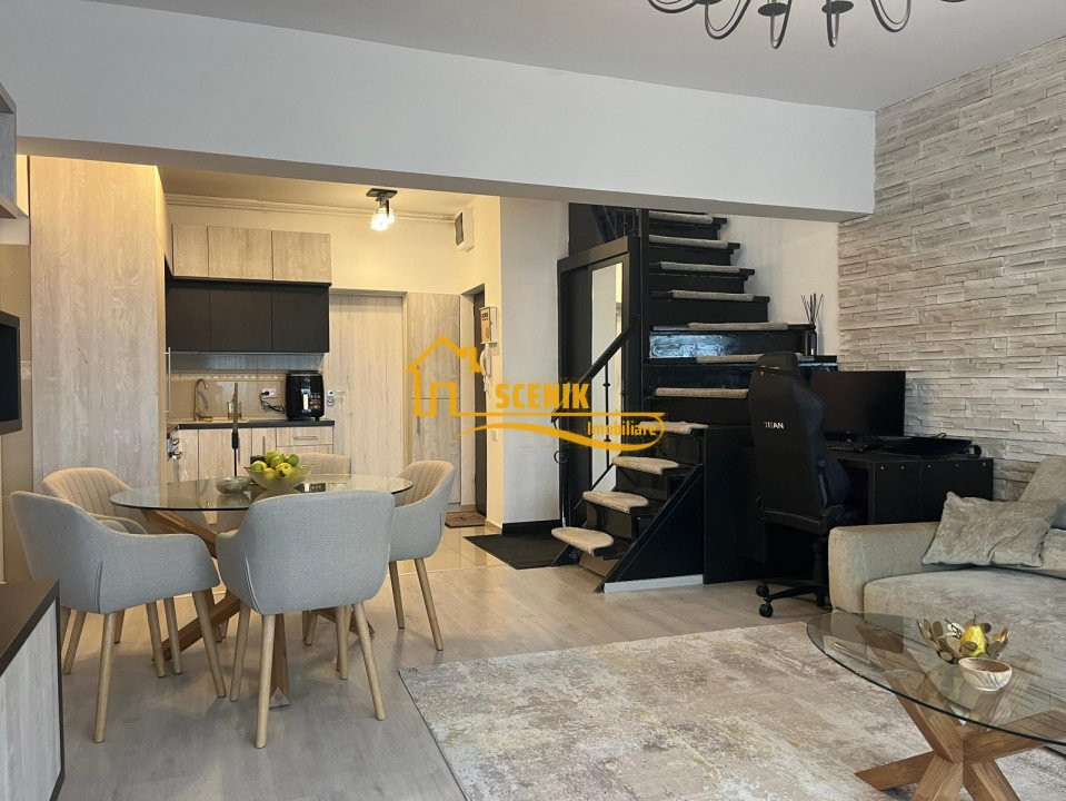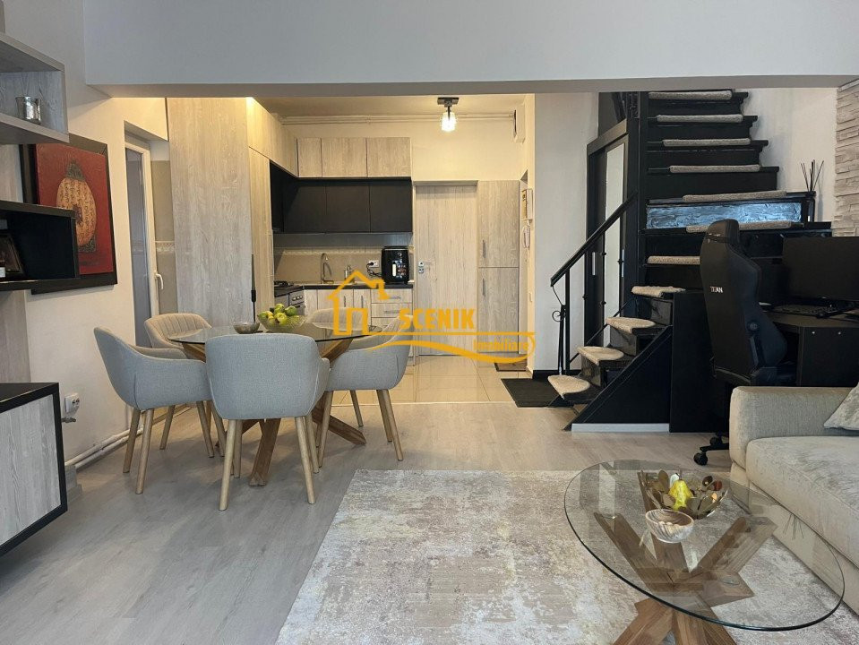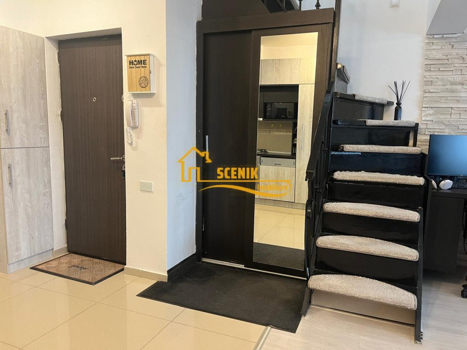 Apartamentul este situat la mansarda unui imobil cu 4 etaje, respectiv etajul 5 si 6 (M1 + M2), avand o structura deosebita si foarte utila, fiind dispus pe doua nivele, trecerea catre M2 se face pe o scara interioara cu structura metalica si balustrada din fier forjat, treptele confectionate din lemn masiv!